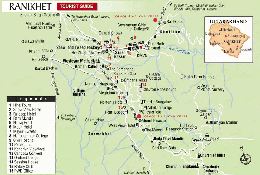 Tariff: Rs 250-700, dorm Rs 100), take Ranikhet’s old road
